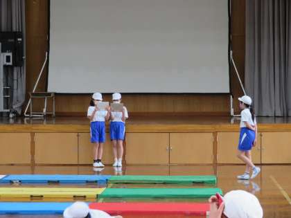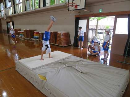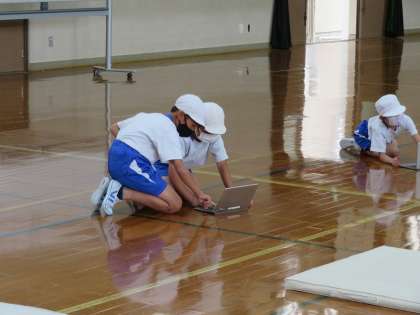 体育のマット運動の学習でも,GIGA端末を使っています。技を動画で撮影し,自分で分析したり,上手な人の動画を見て練習したりして,学習を進めています。