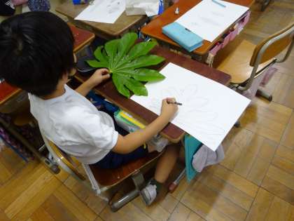 校庭の木や草花の葉っぱをとってきて,じっくり観察して描きました。