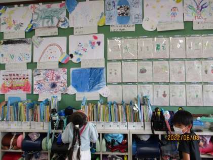 2年生になって初めて図画工作科で鑑賞会をしました。割り方を工夫したり,でてくる世界を工夫したりして,描き上げた「ふしぎなたまご」の作品をみんなで鑑賞して,隣の席の人といいなと思った人に鑑賞カードを書きました。友達の作品の綺麗なところや頑張っているところなどたくさんの良い所を見つけることができました。