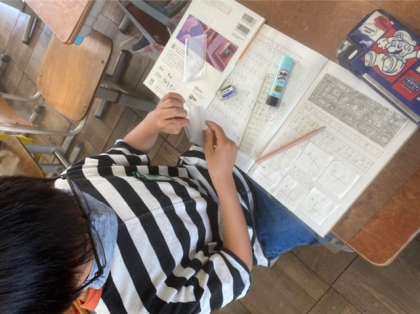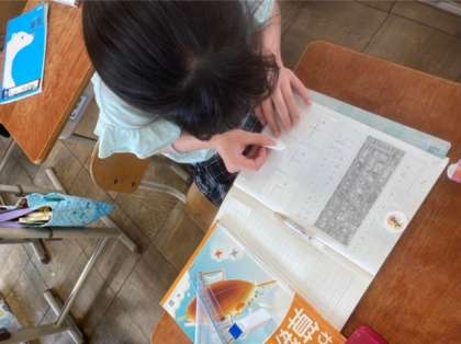 算数科で直線の交わり方について学習しました。「十字になっているところがある。」「交わっているところが直角になっているよ。」と気が付いたことを子どもたちはたくさん見つけていました。「2本の線が交わっているところが直角になっている2本の直線を垂直である」ということを学習しました。