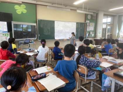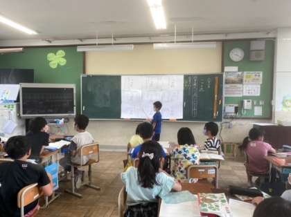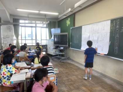 国語科「一つの花」では,題名にこめられた作者の思いについて考えました。登場人物や場面のつながりから,「読者に一つの喜びを大切にしてほしいのだと思う。」「一つの幸せを大切に生きてほしいのだと伝えたかったのだと思う。」と話し合っていました。