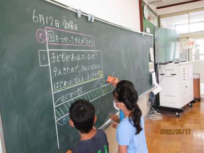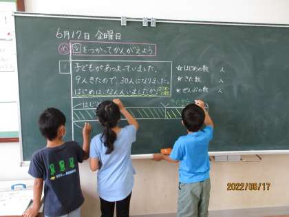 算数科の授業では,図を基に式を考えるという学習をしています。問題で聞かれていることを図に書いて考えることで,たしざんなのか,ひきざんなのか,今説いている問題は何を聞かれているのかが可視化されて頭の中で整理されやすくなります。ひと手間かかる作業ですが,問題が分かりやすくなるのでこれからも使っていってほしいなと思います。