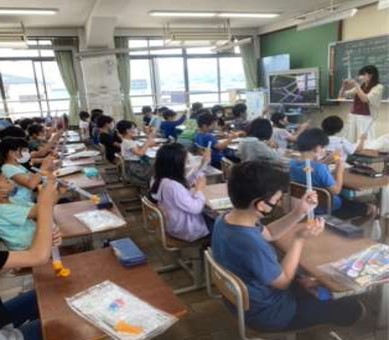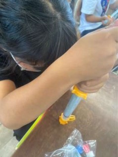 いよいよ実験開始。筒状の実験器具にとじこめた空気を押してみると…,あるところからびくともしません。「かたい〜!」「動かない〜!」と,子どもたちは力いっぱい押していました。とじこめた空気に力を加えると,空気の体積が小さくなることがわかりました。
