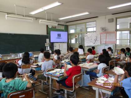 給食の時間は,コロナウイルスの影響でさまざまな制限もあり,黙食で給食を食べているので,友達とわいわいご飯を食べることはできませんが,その中でも放送委員の放送や栄養教諭の先生が作ってくださっている給食クイズを見て,給食時間も楽しく過ごしています。17日(金)の給食クイズは,給食で鰆が出たこともあり,「『魚へん』がつく漢字クイズ」でした。子どもたちは,普段どこで見ているのか,漢字をよく知っていて,たくさん答えていたのでとても驚きました。生き物が好きなどの興味が,漢字の興味などに結び付いて,意欲的に学習していってくれたらいいなと思います。