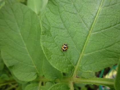 みんなで,じゃがいもの葉を食べる「ニジュウヤホシテントウ」を探していると他の生き物たちも現れます。このテントウムシの名前はご存じですか?ぜひ,皆さんも生き物たちを探して観察してみてくださいね。
