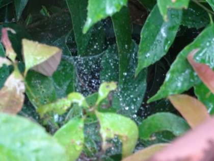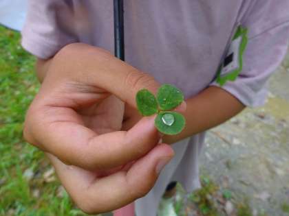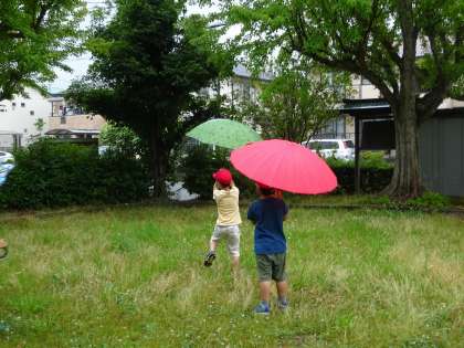雨の日の公園探検へ出かけました。雨の日は,晴れの日の公園と大違い。普段は嫌なクモの巣も雨のしずくでキラキラ光ってきれいです。クローバーにも水滴がついて,「宝石みたい。」と大切そうに眺める子もいました。あまり雨の日の公園へ行くことはないけど,行ってみると発見だらけです。着替えや長靴等用意してくださりありがとうございました。