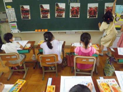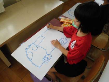 学校に来た消防車を図画工作科の時間に描いています。写真を見ながら,前から,後ろから,ななめ前からなど構図を決め,写真をじっくり見ながら描いています。タイヤを大きく,いろいろな設備も詳しく細かく見ていきました。完成が楽しみです!