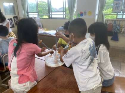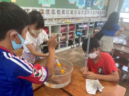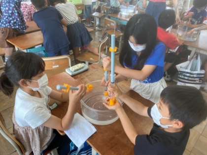 理科「とじこめた空気と水」の学習で,とじこめた水はおしちぢめられるのかについて調べました。子どもたちは,前回までに学習したとじこめた空気の実験をもとに,「おしちぢめられると思う。」「小さくなるかもしれない。」と予想を立てていました。