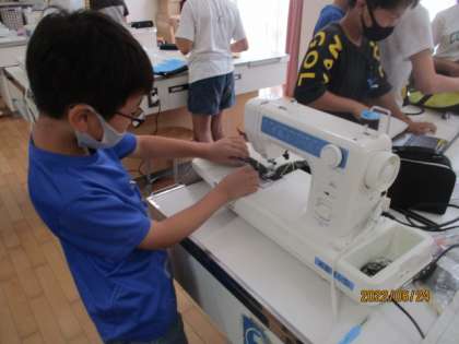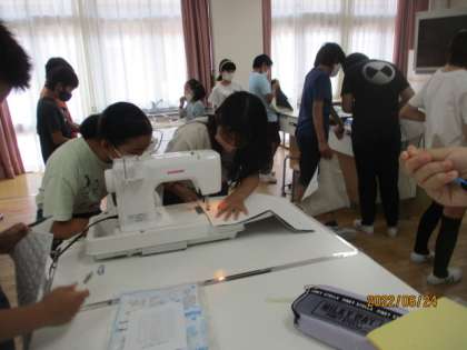 家庭科「思いを形にして生活を豊かに」の学習で,ナップサックづくりに挑戦しています。家庭科2年目ともなり,ミシンにも慣れているようで,みんな順調に進めています。