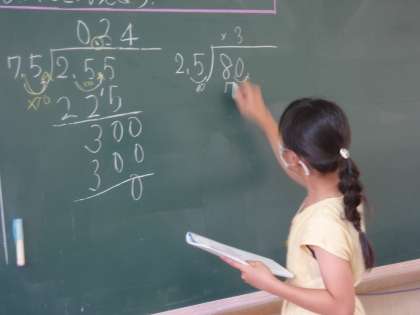 算数科では,小数のわり算を学習しています。わり算の性質をつかって,わり算の筆算に挑戦しました。筆算となると少し難しく感じるようですが,自分の考えを友達に発表したり,クラス全体で話し合う中で,理解につなげることができました。