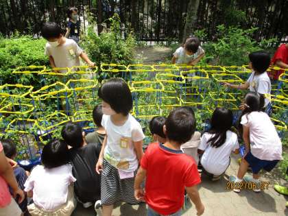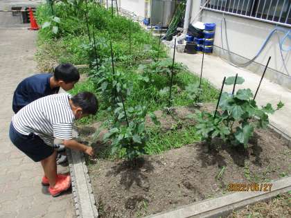 先週の水曜日,木曜日に地域の方に畑を見せてもらい,質問したことを参考にして,オクラとピーマンに支柱を立てました。どのクラスもどんどん大きくなってきていて,花や実をつけ始めています。「水やりは10日に1回程度でいいけど,毎日声掛けをすると大きく育つよ」と地域の方にアドバイスを頂いたおかげで,朝学校に来てすぐに育てている植物のほうに向かい,「おはよう」「大きく育ってね」と声を掛けている子どもたちが増えました。そろそろ収穫が近づく時期がやってくるので,毎日欠かさず観察していきたいです。