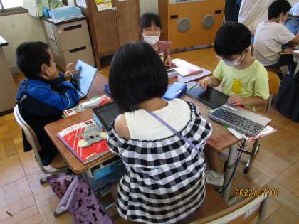 国語科の授業の合間には、漢字ドリルだけでなく、GIGA端末を使いながらも漢字の学習を進めています。ミライシードにある漢字テストを使って、自分でテストをしたり、漢字のなぞりを手やタッチペンでするなどして学習を進めています。漢字は,大人になっても使う基礎なのでしっかりと学習して覚えていってほしいです。