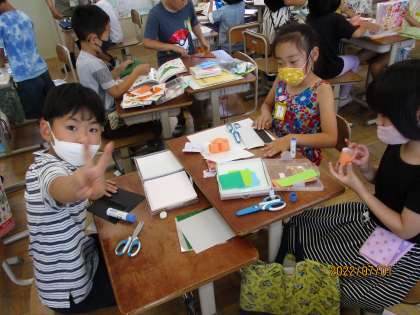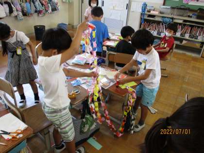 七夕に向けて笹に願い事の短冊を結びました。「お金持ちになりたい」「サッカー選手になりたい」という子どもらしい願い事をかいている子もいれば、「コロナが早く収まりますように」「ウクライナの戦争が早く終わりますように」という大人さながらの願い事を書いている子もいて驚きました。短冊を飾った後は、折り紙で飾りを作って笹を飾りました。折り紙の本を見ながら色々なものを作って飾っていて、素敵な笹が出来上がりました。
