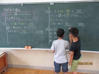 算数科では、2桁や3桁の数の計算を学習しています。10のまとまりをもとに「『80+30』は10のまとまりが8こと3こで8と3を合わせて10のまとまりは11こ。だから、80+30=110になる。」という計算をしています。10のまとまりを考えると数が大きくなっても簡単に計算することができるので、数が大きい時こそめんどくさがらずに基本の考え方を大事に計算してほしいなと思います。