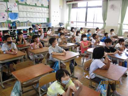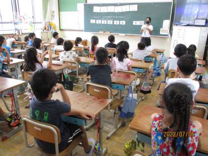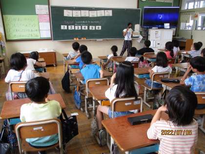 2年生になって初めての外国語の学習がありました。ALTの先生にも来ていただいてクラスみんなで楽しく英語に親しみました。1から20までを英語で言ってみたり、英語の歌を歌ってみたり、いくつかなクイズをしてみたりと積極的に英語を使って学習をしました。「いくつかなクイズ」はテレビに映し出されるフルーツの中で「How many 〇〇?」と聞かれたものを1から10の英語を使って答えるクイズです。最後には出題者のほうにも挑戦をして「How many bananas?」「How many oranges?」と上手に英語でクイズを出していました。
