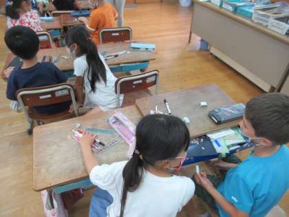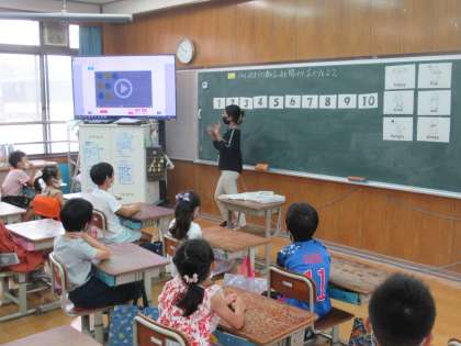 2年1組も英語学習が始まりました。ALTの先生と一緒に、挨拶をしたり、数の数え方を練習したりしました。英語の時間はみんな大盛り上がり。楽しく2時間の学習を終えました。