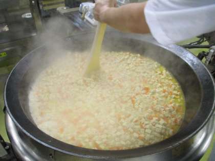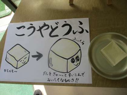 今日は,料理する前の高野どうふを展示しました。「カッチカチ!!これが本当に柔らかくなるの!?」と目を丸くする人を見て,樋口先生はにやにやしながら「そうなんですよ〜!!」と答えます。スポンジのように,おいしい出汁をすって,ふっくらとした高野どうふになります。かむと,じゅわ〜っと出汁がでてきて,おいしかったですね。