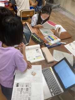 国語科「新聞を作ろう」の学習で,新聞作りに取り組んでいます。班ごとにどんな記事にするか話し合ったり,インタビューやアンケートを取ったりと“取材”を進めています。どんな新聞が出来上がるのか楽しみです。