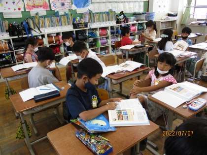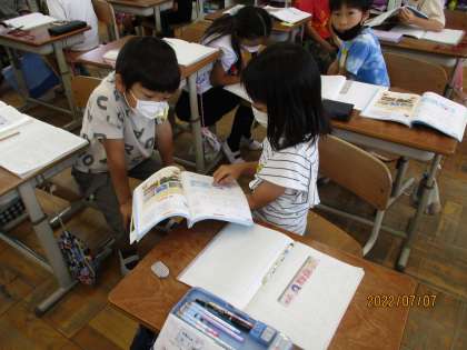 今日の学習では「100をこえる数」のまとめとふりかえりをしました。「832」と「89○」のように一方の数字は3桁すべて分かっていて、もう一方の3桁のうちどこかの位が隠れているような数の大小を比べる問題を友達に説明し、「100の位は同じだけど、次に10の位を見たら隠れているほうが大きいから隠れているほうが大きいと分かる。」と上手に伝えていました。練習問題もしっかりと取り組んでいて、ふりかえりも「大きな数の大小の比べ方が分かった。」「10をもとにしたら考えやすいことが分かった。」と分かったこと、これから使えそうなことなどをしっかりと書いていました。