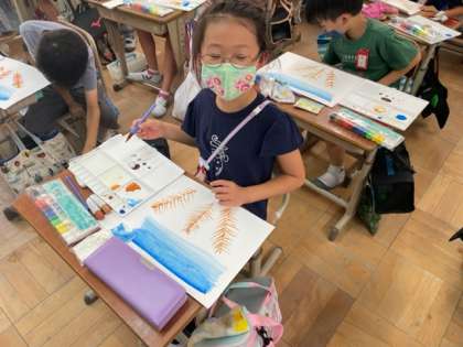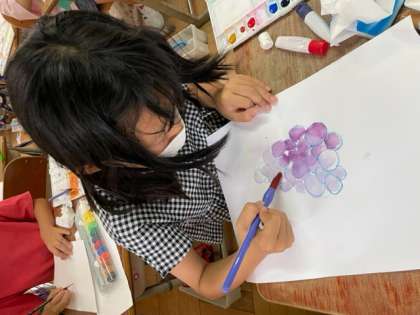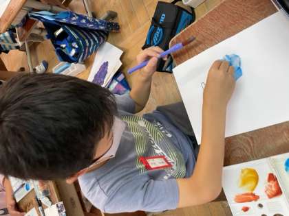 ぼかし、にじみ、かすれ、吸い取りの4つの技法に挑戦しました。「ぼく、画家になれるかも!!」「わたしにこんな絵がかけるなんて〜!」と自分に秘めた力があると気づいたようです。水彩絵の具を使って子どもたちがイメージを広げられたらうれしいです。