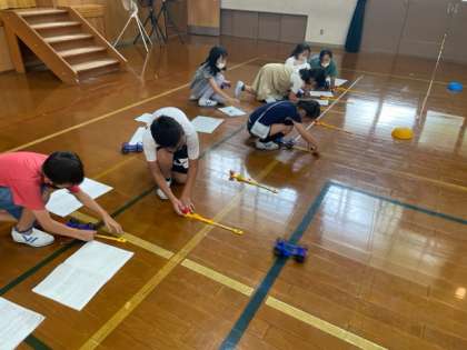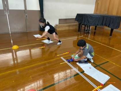 ゴムで動く車を作って実験中です。ゴムを伸ばす長さを5センチ、10センチ、15センチに変えてみると「すごい!!予想よりも遠くに進んだ!!」「15センチのときが一番動く距離は長いね」」などいろいろなことに気づいたようです。次回は結果をもとに考察します。