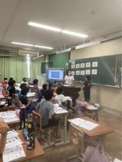 外国語活動「What time is it?」の学習で、好きな時間を尋ね合いました。「I like bath time.」「What time is it?」「It's 8!」と,英語を使って尋ねたり答えたりしました。好きな時間が同じ時には「Me too!」、驚いた時には「Oh!」など、リアクションも英語でしていました。