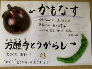 京野菜のごまみそかけは、京野菜の「賀茂なす」と「万願寺とうがらし」を使いました。みなさんが住む京都でつくられたおいしい野菜を味わいながら食べられましたか?