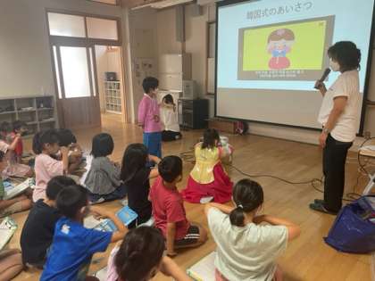 去年に引き続き、京都韓国教育院の方から韓国について教えていただく出前授業がありました。韓国の衣食住について学んだあと、手遊び歌で盛り上がりました。「北海道に行くより近いなんてびっくりした」「日本の手遊び歌と同じ歌が韓国語でも歌われていてうれしかった」など振り返りました。