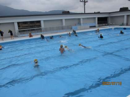 2年生の水遊びの学習が終わりました。学習を通して、「いどう」と「うく、もぐる」という活動を楽しみました。見極めテストで「ロケットジャンプ」「イルカジャンプ」「輪くぐり」「ひきふね」「うき(大の字)(ふし)(だるま)」をしても、みんな上手に移動や、浮きをできていました。顔をつけるのが怖い子も鼻の下まで顔をつけたり、鼻をつまんで顔をつけたりと自分なりの精一杯で頑張りました。3年生からの水泳学習も頑張ってほしいです。