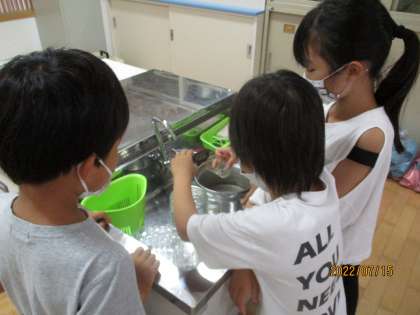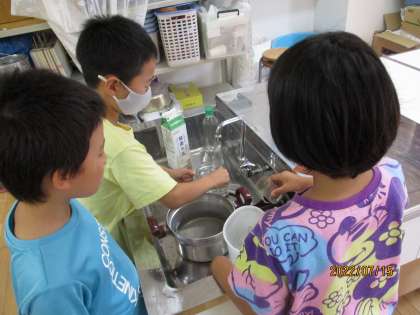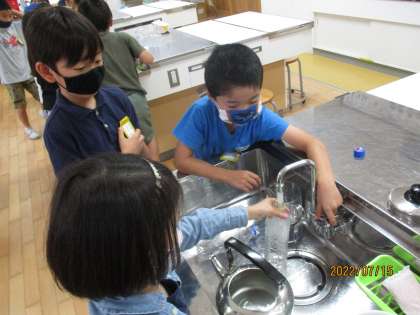 今日の学習では、1Lのものをよそうして実際に諮るという学習をしました。家庭科室に行って、鍋ややかん、ボウルなど1Lだと思うものを予想して、1Lますを使って測りました。最後は大きなボウルに何L入るでしょうクイズをして、みんなで予想をしました。子どもたちはみんな楽しそうに学習をしていました。