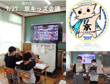 さて、京都市では、学校教育を通して子どもたちの主体性・社会性を育む取組の一環として、小学校では「京(みやこ)キッズ会議」を開催し、各校の代表児童が集い、より良い学校生活について話し合う場を持っています。今年度は、7月27日に本校の児童会代表の6年生2名が初めて参加しました。参加校は京都市小学校31校でした。