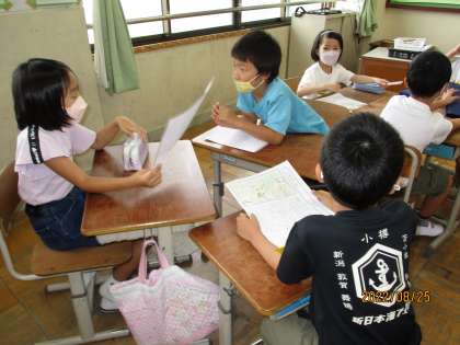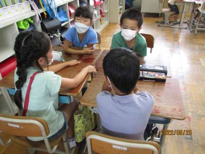 今日の国語の授業は、夏休みに行った場所や夏休みの思い出についてみんなで話しました。絵日記を使って発表している子もいれば、絵日記に書いた以外のことを発表していた子もいて、夏休みの間に色んな所に連れて行ってもらってたくさん楽しい思い出を作ってきたんだなと感じました。初めての体験や他府県に行っていろんな場所で思い出を作った子もいて、みんなで「楽しそう」「そこの場所知ってる」と交流し合っていました。夏休みの間、安全に気を付けながら楽しく思い出を作ってくれたようでとてもよかったです。