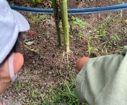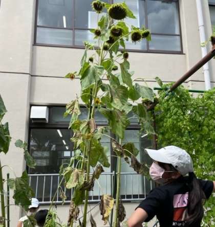 理科ではヒマワリ、ホウセンカ、ダイズの成長を観察しています。以前ホームページでもお伝えしましたが、夏休みに入ってすぐ花を咲かせたヒマワリ。今日様子を見に行くと…。「先生〜ヒマワリがくたぁ〜ってなってる!」「シャワーみたいな形してる〜」と、見頃の過ぎた様子に残念そうでした。一方、地面に近づくとヒマワリの根が見えて、「え!根っこが見えてる〜!」と盛り上がる様子もうかがえました。