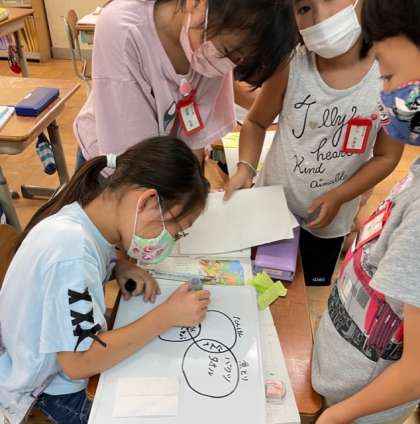 国語では、ベン図を活用して対話の練習を行いました。山小屋で三日間すごすなら何をやりたいかを最初に出し合います。「たんけんに行きたい!」「川で魚とりしよ〜」「きもだめしは絶対やりたい!!」など大盛り上がり。そのあと、必要なものについて話し合いました。「探検と魚とりには軍手があったほうがいいなぁ」「ろうそくはきもだめしだけに必要だね」と、ベン図を使って班での考えをまとめました。今後も思考ツールを活用した話し合いができたらいいなと思います。