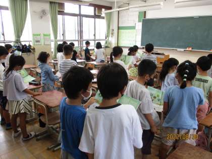 昼間はまだまだ蒸し暑いですが、朝と夜が少しずつ涼しくなってきて、だんだんと秋を感じる季節になってきました。今日は「季節を感じて歌おう」ということで「虫の声」を歌いました。歌に出てくる秋の虫の鳴き声はどんな鳴き声かを想像しながら元気に明るく歌いました。「虫の声」は100年以上前、教科書に載せるために作られた歌だと知って「すごい」「ひいひいおばあちゃんぐらいかな」ととても驚いていました。