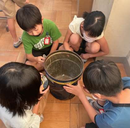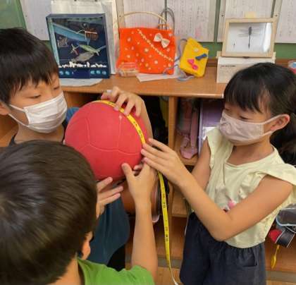 学習のはじめに、まきじゃくとものさしを比べて、まきじゃくの良さを話し合いました。「丸いものの長さをはかれる!」「ものさしより長い長さをはかれそう」などの声が聞こえたところで、実際に教室でまきじゃくを使っていろいろなものの長さを計りました。