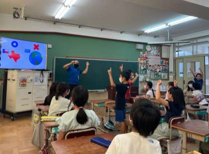 外国語活動では、ALTのルイス先生と久しぶりにお話をしました。テキサスご出身のルイス先生。「テキサスと日本はどっちが大きいと思う?」「じゃあ、テキサスと宇宙は?」など、クイズに答えて盛り上がる子どもたちでした。