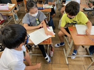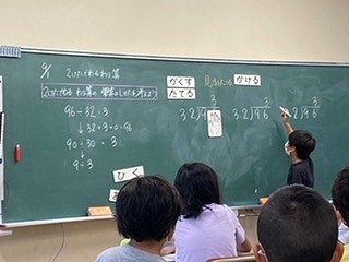 算数科では、2けたでわるわり算の筆算のしかたについて学習しています。10円玉で考えた2けたのわり算の計算のしかたをもとに話し合いました。「たてる・かける・ひく・おろすは、1けたでわる時と同じだ!」「だいたいの見当をたてて計算するといいね」と、これまでの学習をもとに計算のしかたを話し合っていました。