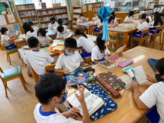 子どもたちは、図書館に行く時間をとても楽しみにしています。好きな本を迷いながら選び、とても集中して読んでいます。