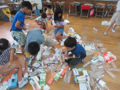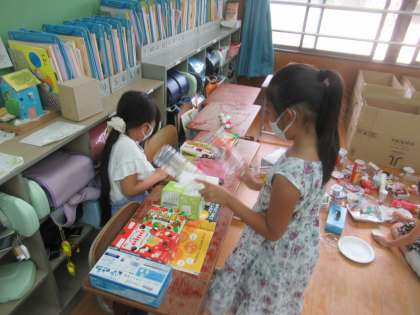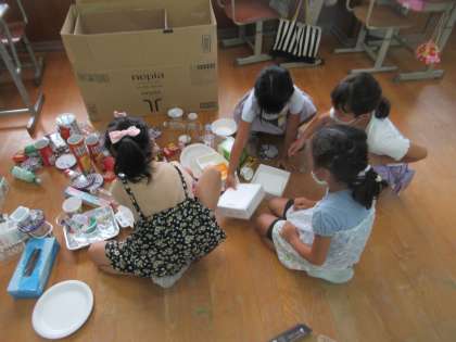 今日は、1時間目。おうちから持ってきていただいたたくさんの材料を教室中に広げ、どんなことができるかをいろいろ考えてみました。
