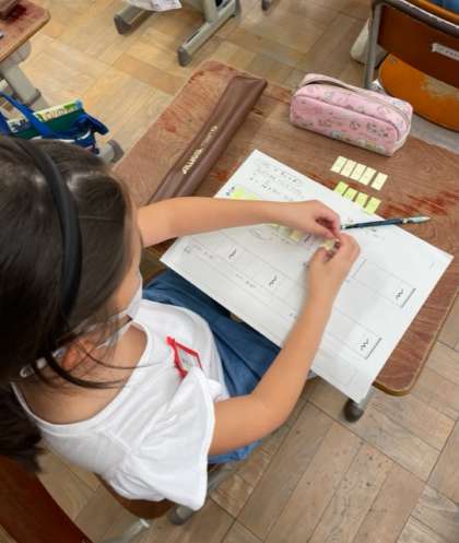 2学期の音楽スタートです。お馴染みのリズムゲーム「3時のおやつ」からはじまり、繰り返しや変化に気を付け、リズムづくりを楽しみました。リズムづくりでは、四分音符や八分音符をタンとタタに置き換えて、小さいまとまり、大きいまとまりをつくりました。できたリズムを手でたたいてみると「いい感じのリズムができた♪」「すごい!〇〇さんと全く同じリズムやった!!」と楽しむ様子が伺えました。