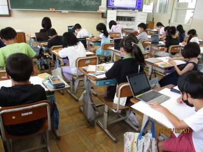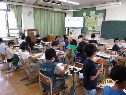 子どもたちはお話から想像した様子を自由にどんどん書き進めています。「大きくかくこと、丁寧にかくこと、時間を守ること」の3つの約束だけをして、自由にということをテーマに楽しそうにかき進めています。画用紙に大きくかくことには苦戦をしていて、大きくかいたつもりでも遠くから見てみたら全然大きくないということもありますが、自由に丁寧にかき上げてくれたらいいなと思います。