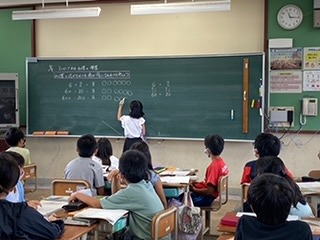 自分の考えは、グループで話し合ったり、全体で黒板を使って説明したりしています。友達の考えを「なるほど!」「そう考えるとわかりやすい!」と子どもたちは自分の考えと比べながら聞いています。