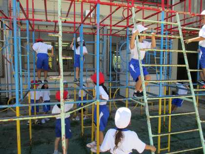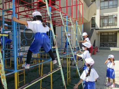 総合遊具の使い方を学習しています。棒を持つときの握り方や,三点支持など安全に楽しく遊べるように学習しました。総合遊具で体をたくさん動かしてほしいと思います。