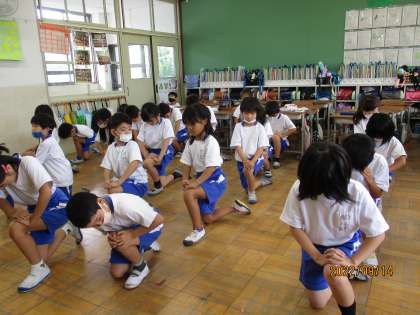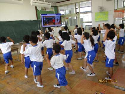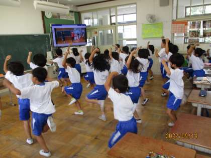 今週は各教室でダンスの練習をしています。体育の授業中だけでなく、休み時間や帰りの会の前に見本の動画を流すと、準備が終わった子から次々に教室で音楽に合わせて自主的に踊って練習している子どもたちの姿も見られます。来週からは学年での合同練習も始まるので、みんなの手本となれるように、細かいところも合わせて頑張ります。