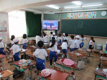 運動会の練習が始まっています。休み時間にお手本動画を見せると楽しんで踊っています。