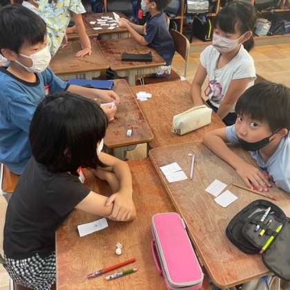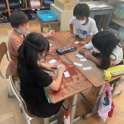 へんとつくりの学習を経て、自分たちでへんとつくりのカードを作成しました。それをグループで持ち寄り、神経衰弱を行いました。「音読みと訓読みを言えないととれないことにしよう!」「音読みなんやったっけ??」など、ルールを工夫しながら楽しく盛り上がっていました。