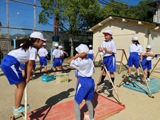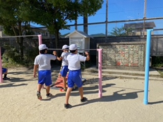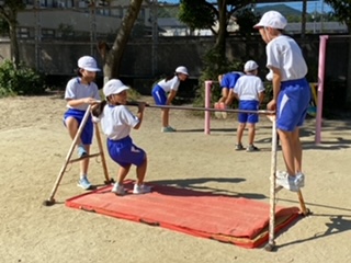 体育科「鉄棒」の学習です。連続技や新しい技に挑戦です。補助具を使ったり、友達とアドバイスをし合ったりしながら練習しました。