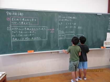 算数科の授業では、1学期に引き続いて、2学期も「図をつかって考えよう」という学習をしています。1学期は「はじめの数」「きた数・つかった数」「全部の数」の3つでしたが、2学期は「きた数・つかった数」が2つでてきて計算をしています。順番に計算するやり方と「きた数・つかった数」を先にまとめて計算する二つのやり方をうまく使いながら計算を頑張っています。