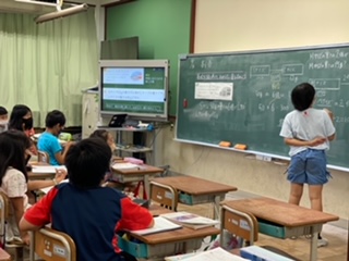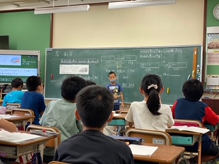 算数科「割合」の学習では、関係図を使って考えています。「もとになっている数は…」「割合は6倍だから…」と関係図に表しながら、分からない数を求めています。